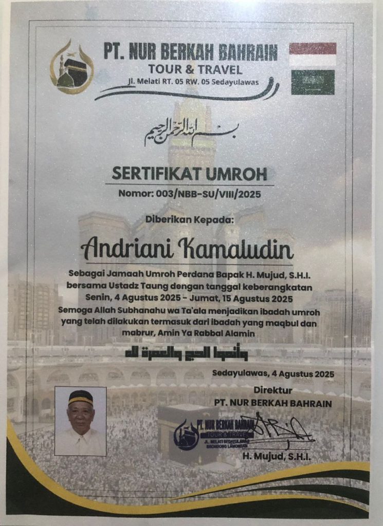 Contoh Sertifikat NURBEBA TRAVEL